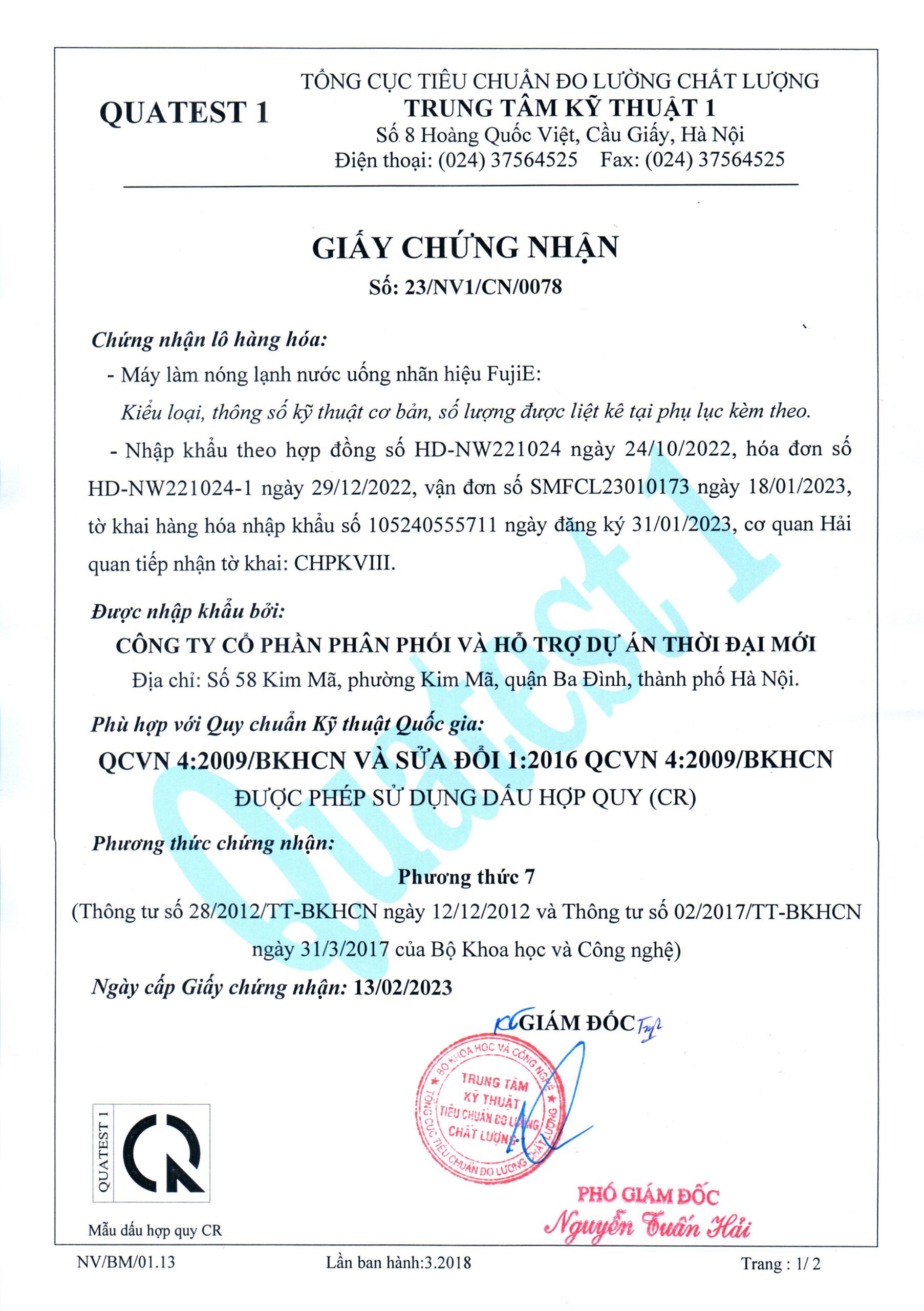Sản phẩm được kiểm định bởi Tổng cục Tiêu chuẩn Đo lường Chất lượng (Bộ KHCN) và dán tem Hợp Quy, đảm bảo đáp ứng tiêu chuẩn an toàn điện và điện tử theo quy định của Nhà nước.
