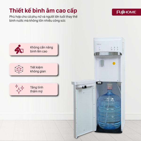 Fujihome WD628C-IM có thiết kế nhỏ gọn, màu trắng sang trọng, giúp tô điểm không gian nội thất hiện đại. Kiểu dáng bình âm giúp việc thay nước dễ dàng, giảm thiểu nguy cơ tràn nước. Khay hứng nước thừa giúp ngăn chảy nước xuống sàn, dễ dàng vệ sinh.