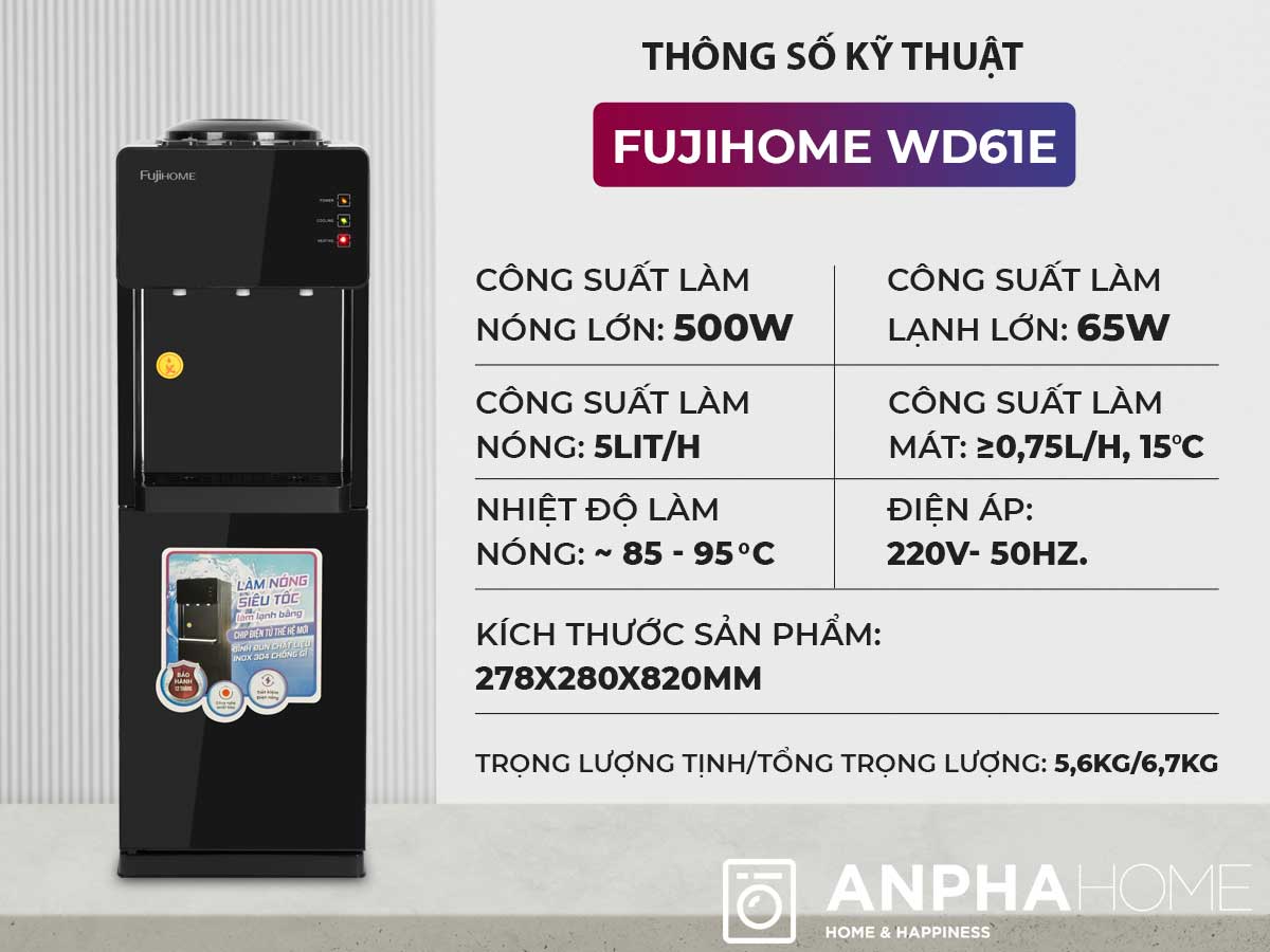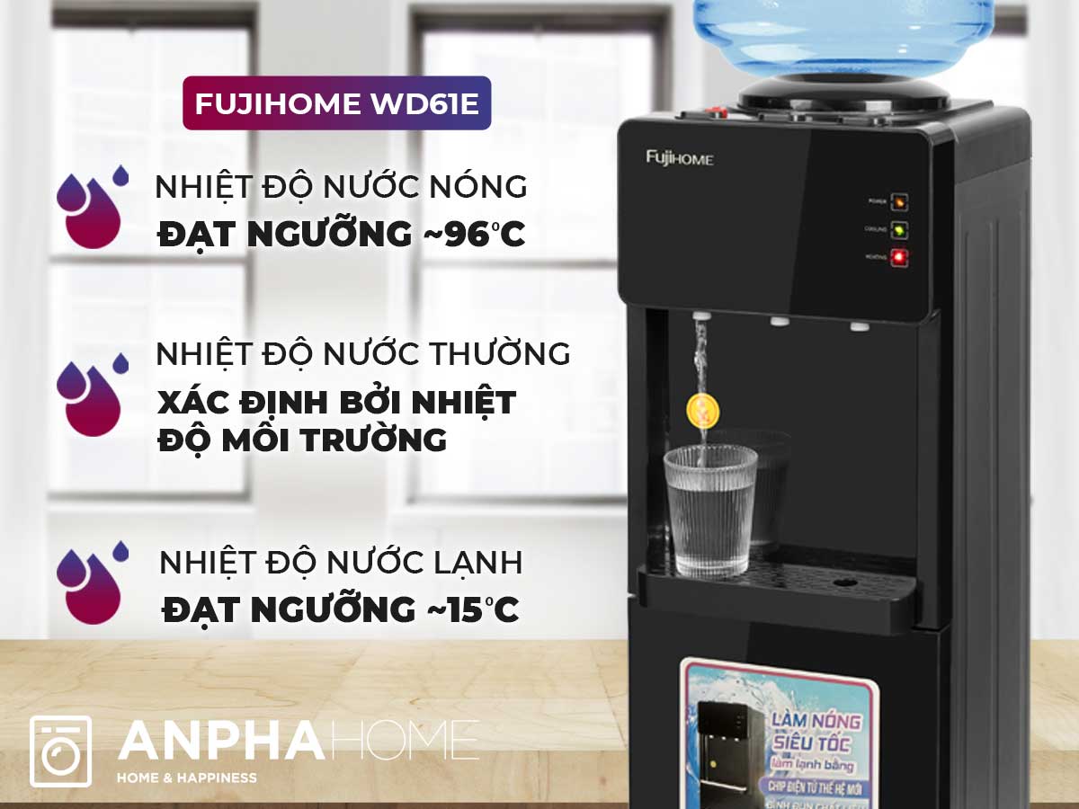 Cây nước FUJIHOME WD61E là lựa chọn tuyệt vời cho những ai muốn sở hữu một sản phẩm chất lượng với giá cả phải chăng. Sản phẩm không chỉ cung cấp nước nóng để pha trà, cà phê hay mì ăn liền, mà còn mang đến nước mát trong những ngày hè oi ả. Thiết kế thông minh và chất lượng vượt trội từ thương hiệu FUJIHOME đảm bảo sự hài lòng cho người tiêu dùng.