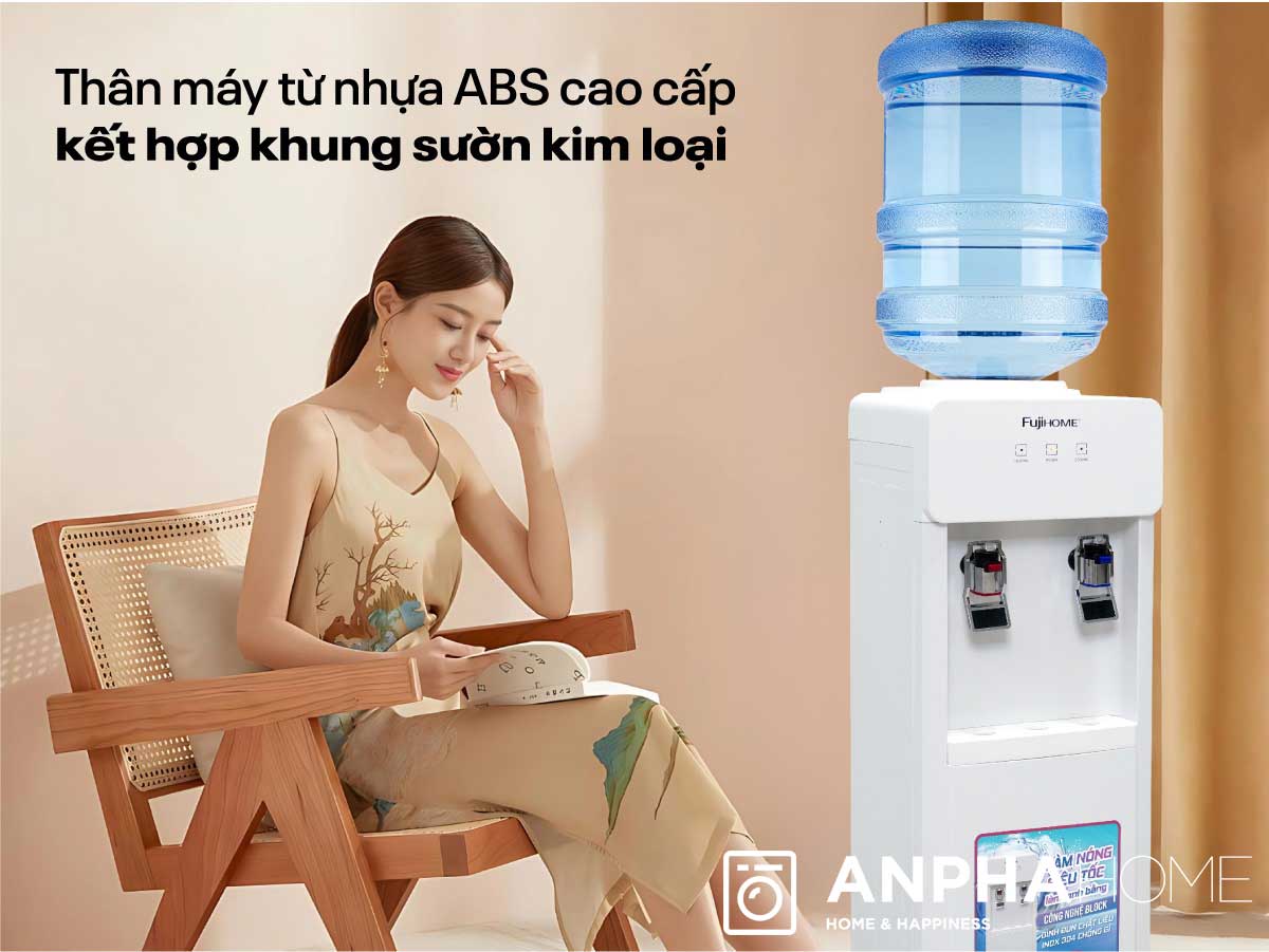 Cây nước nóng lạnh Fujihome WD676C có thiết kế đơn giản nhưng không kém phần sang trọng, dễ dàng hòa nhập vào mọi không gian nội thất từ gia đình, văn phòng, đến trường học. Với gam màu chủ đạo là trắng tinh tế, sản phẩm mang lại cảm giác sạch sẽ và hiện đại. Phần thân máy được làm từ chất liệu nhựa ABS cao cấp, giúp gia tăng độ bền và chịu nhiệt tốt, đồng thời dễ dàng lau chùi vệ sinh.