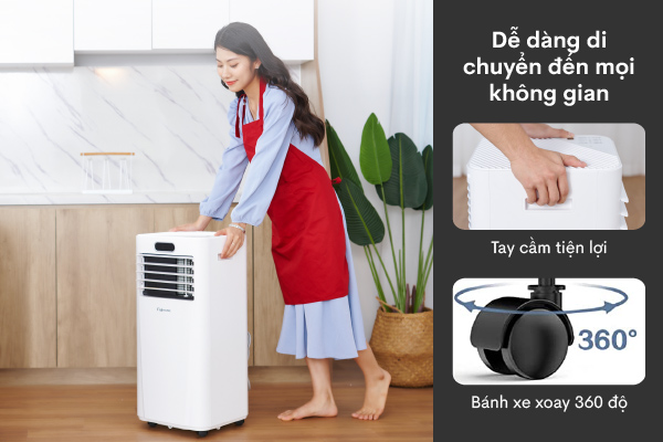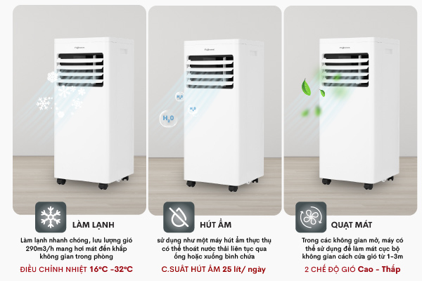 Máy điều hòa di động thông minh Fujihome PAC09 là giải pháp hoàn hảo cho những ai muốn máy làm lạnh hiệu quả nhưng không có điều kiện lắp điều hòa treo tường. Tính di động cao, làm lạnh nhanh, không cần lắp đặt phức tạp.