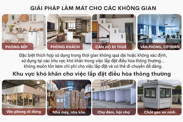 - Quạt làm mát: Trong không gian không kín hoàn toàn, máy hoạt động như quạt làm mát cục bộ.