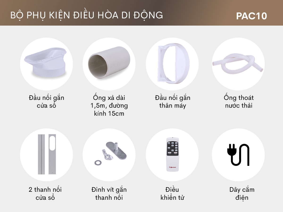 Máy điều hòa di động thông minh Fujihome PAC10 giúp làm mát hiệu quả mà không cần lắp đặt phức tạp. Thiết kế nhỏ gọn, di chuyển linh hoạt, làm mát nhanh chóng.