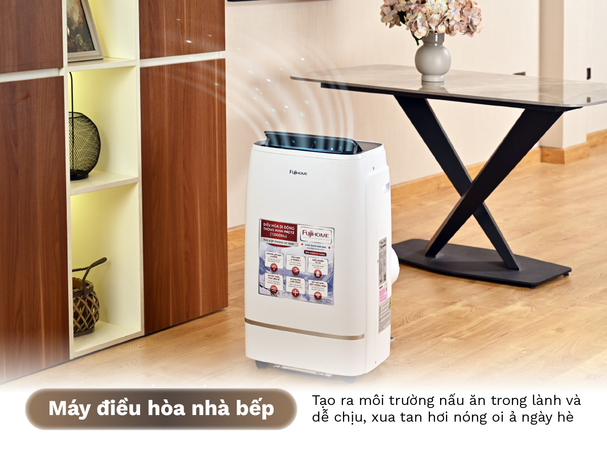 Máy điều hòa di động thông minh Fujihome PAC12 giúp bạn giải quyết vấn đề nóng bức với thiết kế nhỏ gọn, di chuyển linh hoạt, không cần lắp đặt.