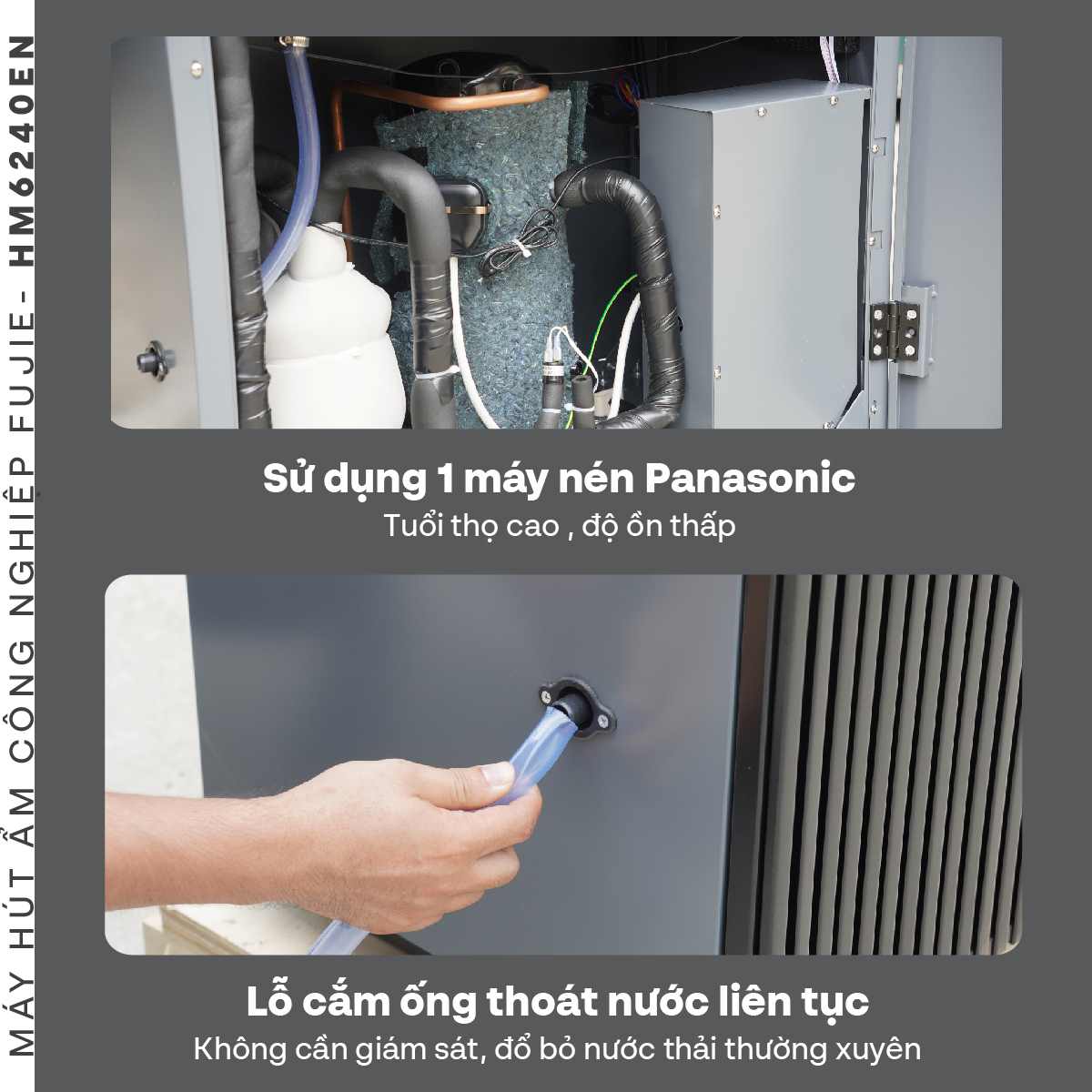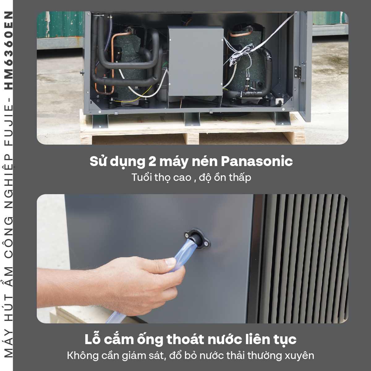 FujiE HM-6360EN sử dụng hai máy nén Panasonic chất lượng cao, đảm bảo tuổi thọ dài, hoạt động ổn định với độ ồn thấp. Máy có công suất hút ẩm lên đến 360 lít/ngày (ở điều kiện 30°C, 80% độ ẩm), thích hợp cho không gian 400 – 550m³, bảo quản hiệu quả các sản phẩm như: