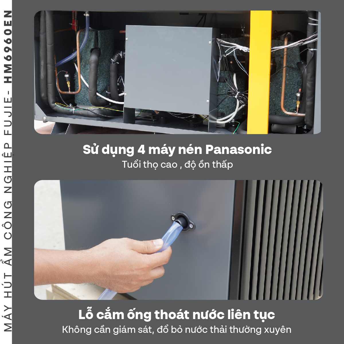 Máy hút ẩm FujiE HM-6960EN sử dụng 04 máy nén Panasonic, mang đến hiệu suất ổn định, tuổi thọ cao và độ ồn thấp. Sản phẩm có công suất hút ẩm lên đến 960 lít/ngày (ở điều kiện 30°C, 80% độ ẩm), thích hợp sử dụng cho không gian từ 1000 – 1300m³, đáp ứng nhu cầu bảo quản hàng hóa trong nhiều lĩnh vực như: