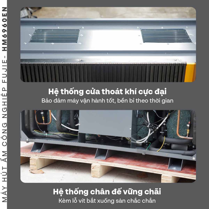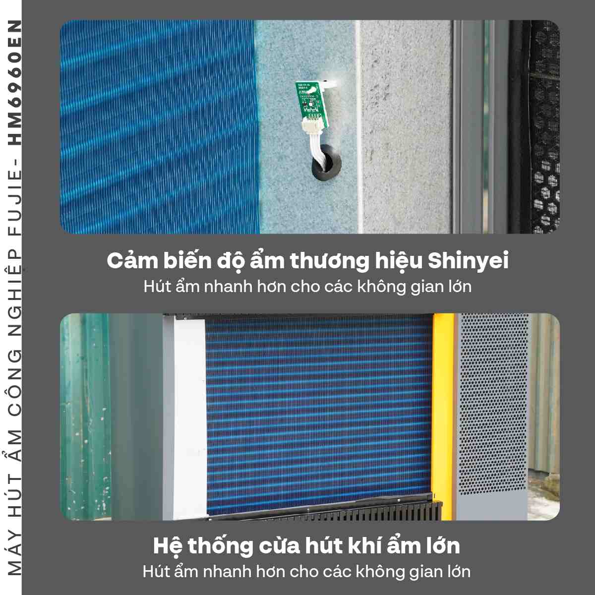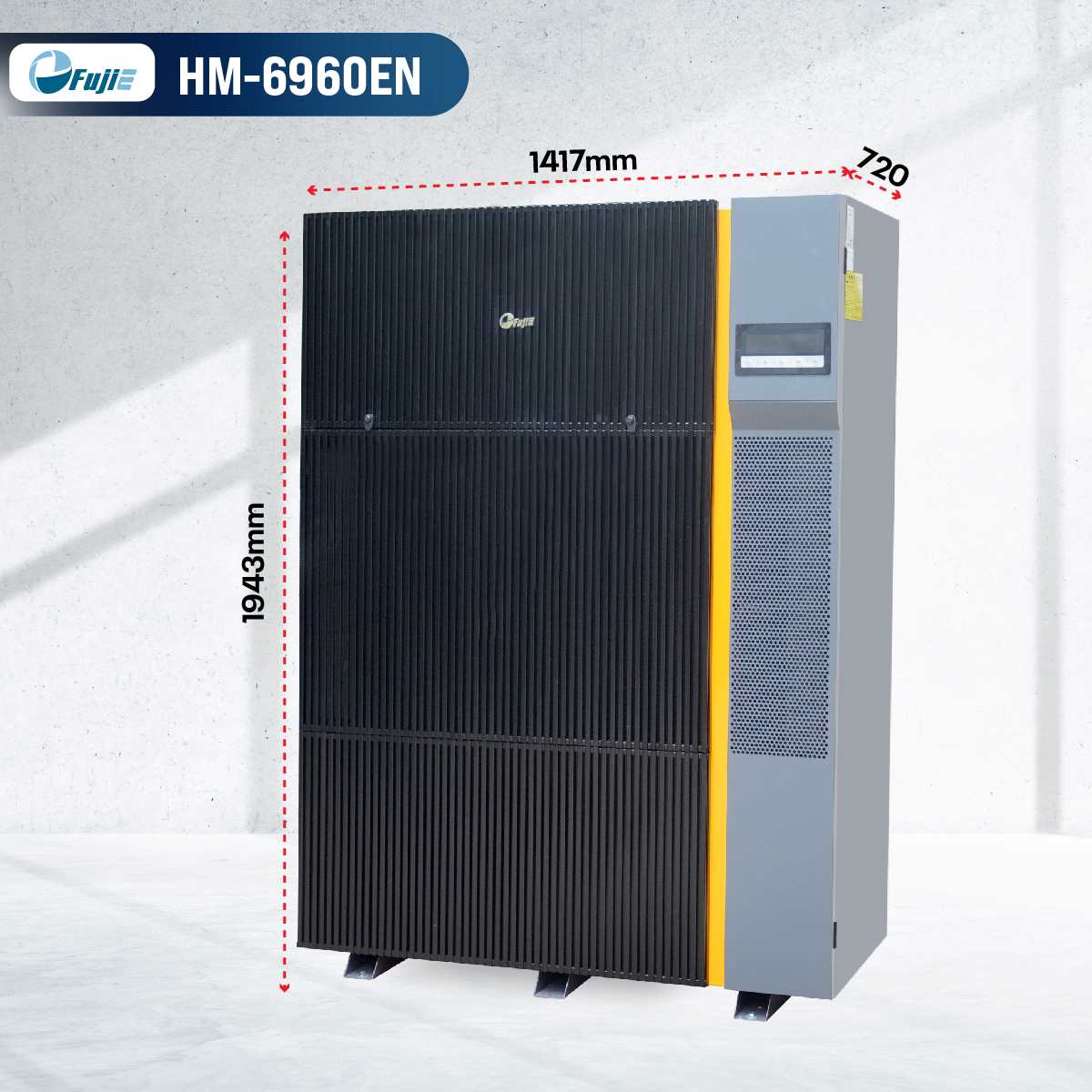 Máy hút ẩm FujiE HM-6960EN sử dụng 04 máy nén Panasonic, mang đến hiệu suất ổn định, tuổi thọ cao và độ ồn thấp. Sản phẩm có công suất hút ẩm lên đến 960 lít/ngày (ở điều kiện 30°C, 80% độ ẩm), thích hợp sử dụng cho không gian từ 1000 – 1300m³, đáp ứng nhu cầu bảo quản hàng hóa trong nhiều lĩnh vực như:
