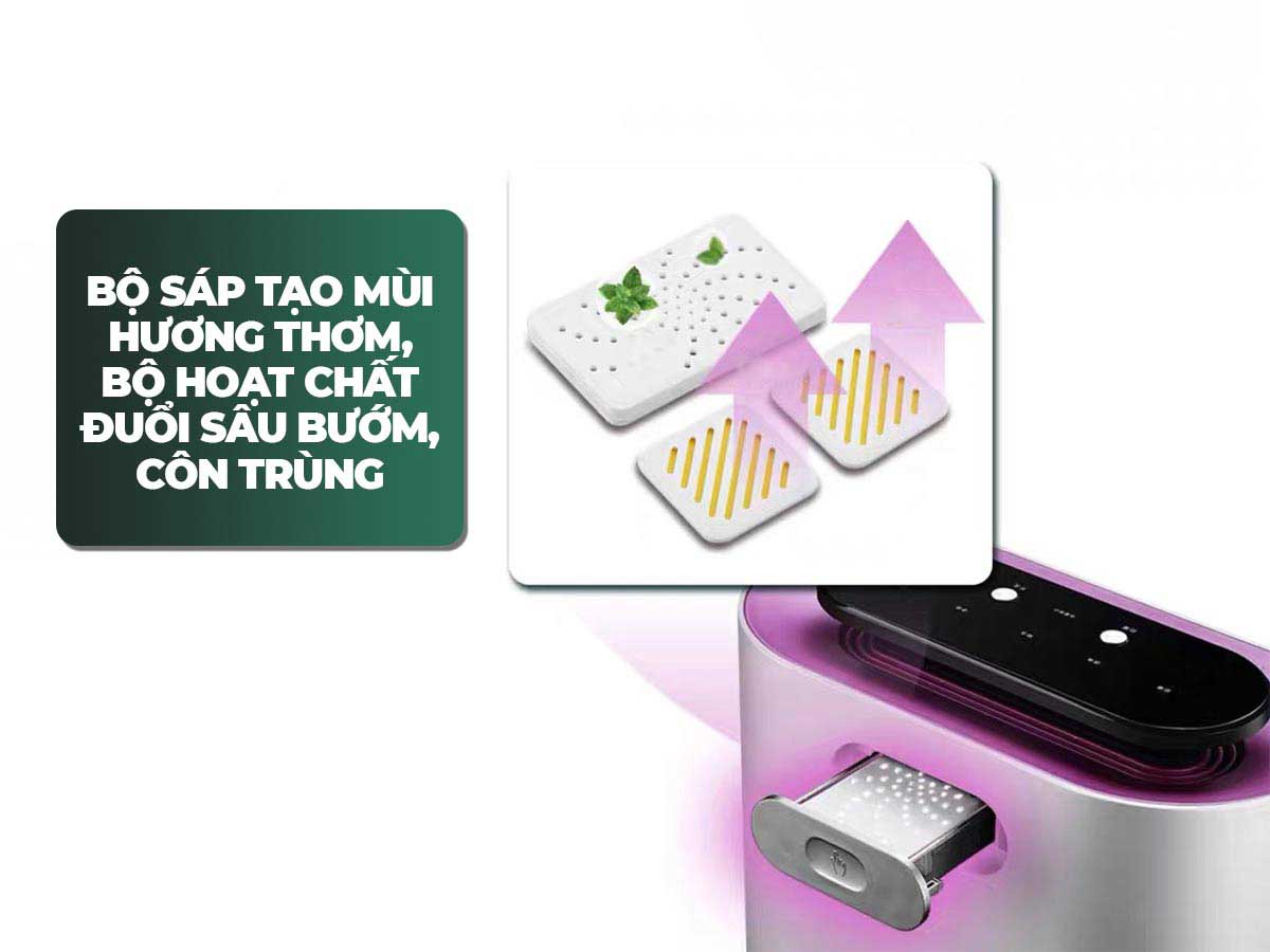 Không chỉ hút ẩm và làm sạch không khí, máy còn được trang bị bộ sáp tạo hương thơm giúp làm thơm quần áo, giày dép, túi xách của cả gia đình. Điều này giúp cho tủ quần áo và các vật dụng cá nhân của bạn luôn giữ được mùi thơm dễ chịu, ngăn ngừa nấm mốc, côn trùng xâm nhập.