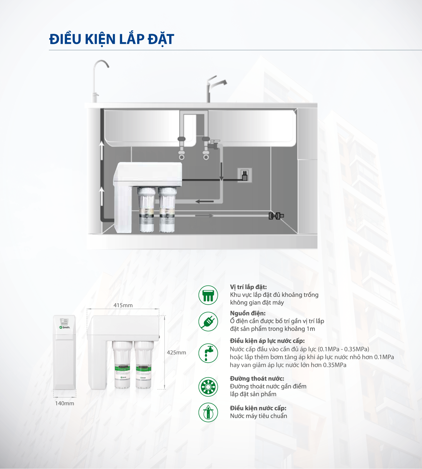 | Áp suất nước cấp phù hợp | 0.1MPa ~ 0.35MPa |