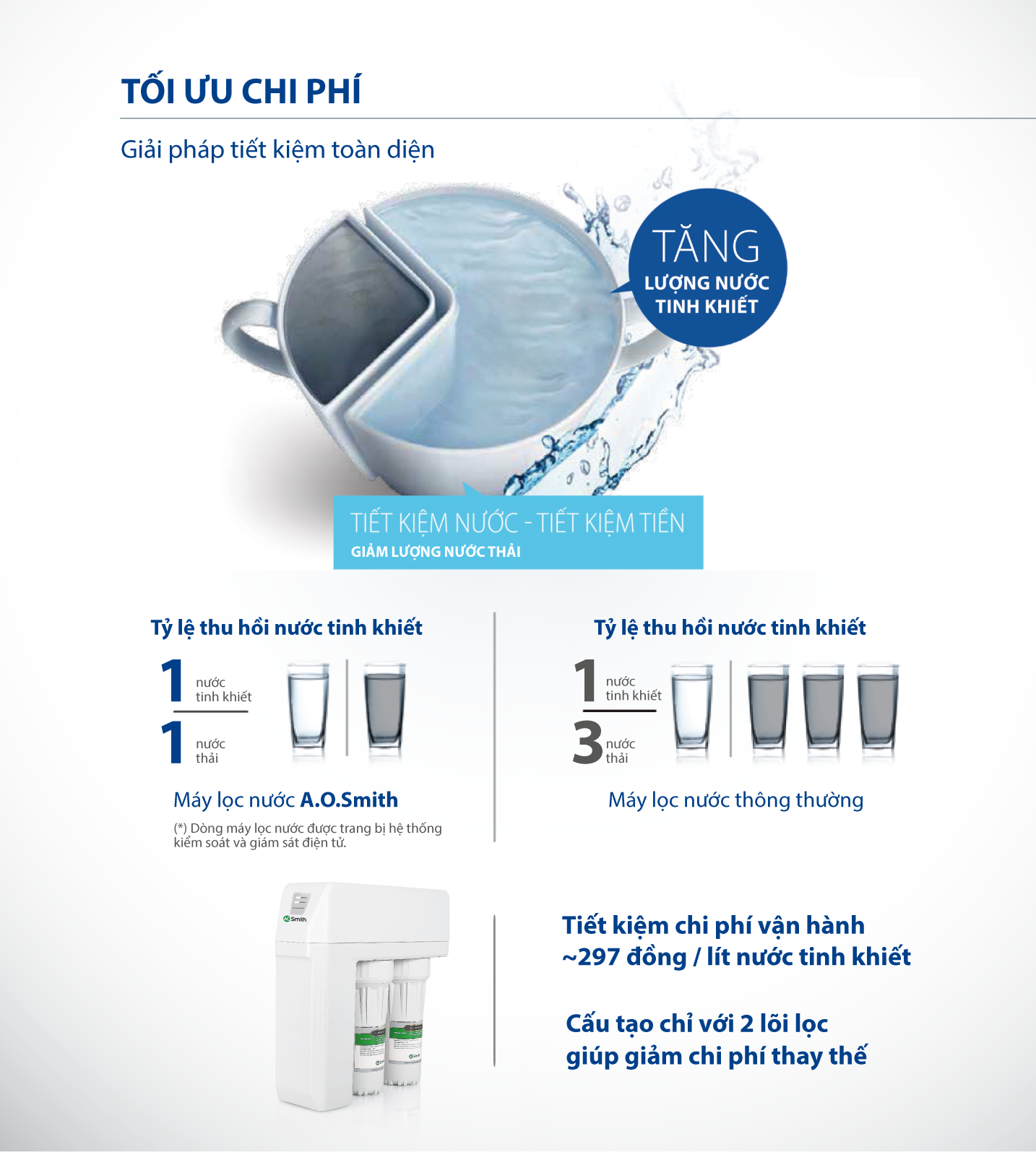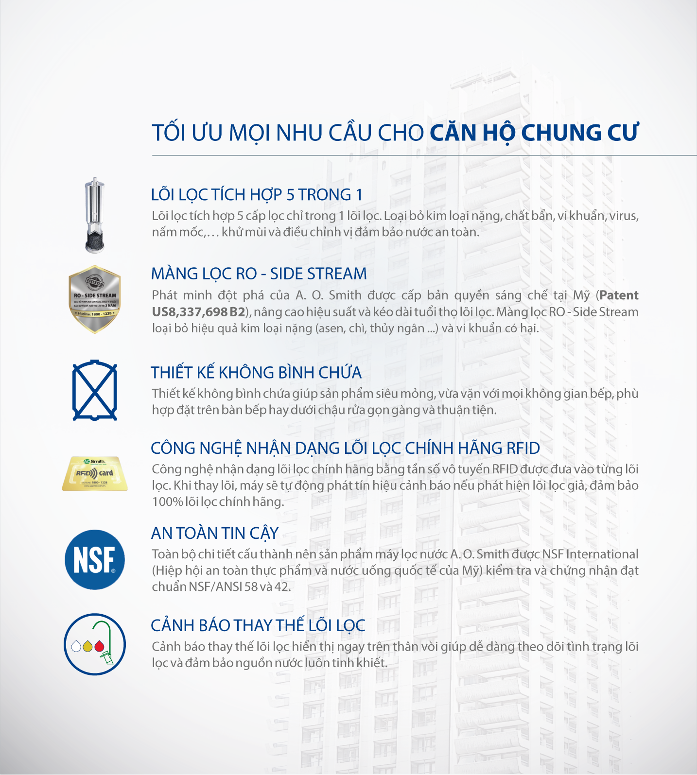 Công nghệ RO-Side Stream, được cấp bản quyền sáng chế tại Mỹ (patent US8,337,698 B2), giúp nâng cao hiệu suất lọc, giảm tỷ lệ nước thải, đạt tỷ lệ nước thải : nước tinh khiết là 1:1 và kéo dài tuổi thọ lõi lọc so với màng RO thông thường. Màng lọc này có khả năng loại bỏ kim loại nặng như asen, chì, thủy ngân cùng các vi khuẩn có hại, mang đến nguồn nước tinh khiết và an toàn tuyệt đối.