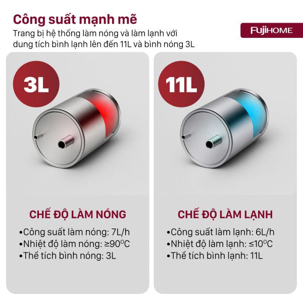 Máy lọc nước Fujihome WP9201C được trang bị hệ thống làm nóng và làm lạnh với dung tích bình lạnh lên đến 11L và bình nóng 3L. Công suất làm lạnh đạt ≤10℃ với lưu lượng 6L/giờ, trong khi công suất làm nóng đạt ≥90℃ với lưu lượng 7L/giờ. Điều này giúp thiết bị có thể phục vụ từ 20 – 50 người một cách dễ dàng, phù hợp cho các không gian có nhu cầu sử dụng nước liên tục.