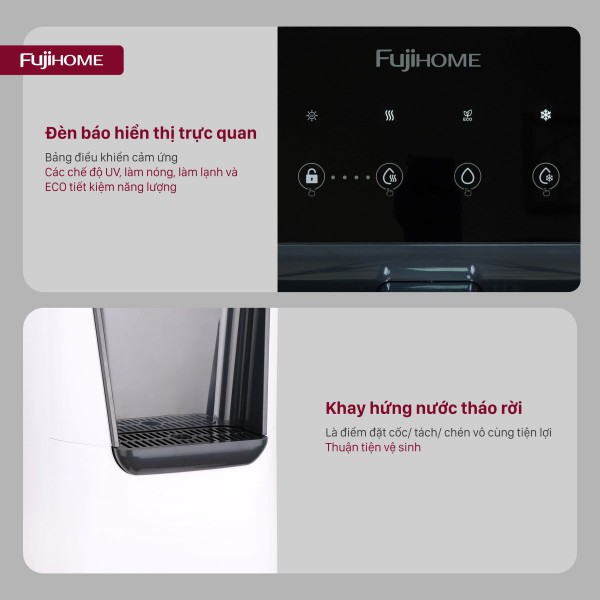Fujihome WP9201C sở hữu thiết kế hiện đại với kiểu dáng tinh tế, phù hợp với mọi không gian từ gia đình đến văn phòng và các cơ sở kinh doanh. Sản phẩm được trang bị bảng điều khiển cảm ứng thông minh, giúp người dùng dễ dàng chọn lựa chế độ nước nóng, lạnh hoặc tinh khiết chỉ với một lần chạm.