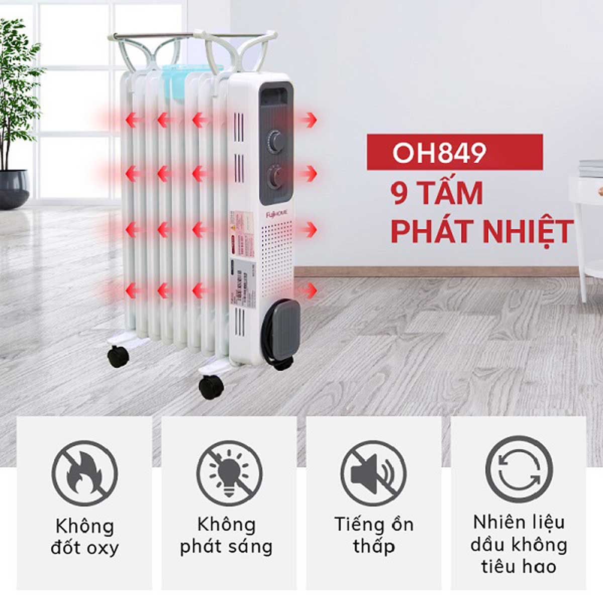 - Không đốt oxy, không gây khô da: Máy sưởi dầu Fujihome OH849 không làm khô không khí, giữ cân bằng độ ẩm trong phòng, không gây khó thở và an toàn cho hệ hô hấp. Đây là lựa chọn lý tưởng cho những gia đình có người già, trẻ nhỏ, hoặc người mắc các bệnh về hô hấp.