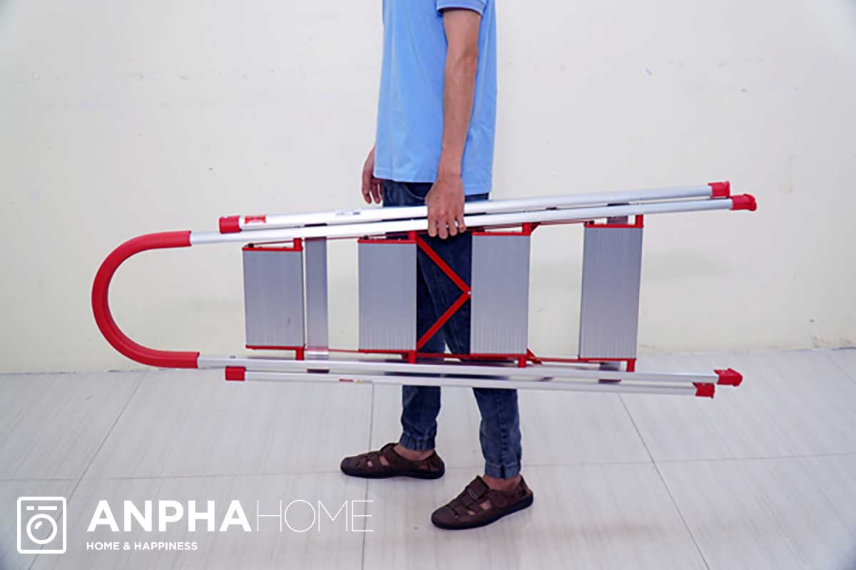 Khi mở ra, thang có kích thước 520mm (ngang) x 740mm (dài) x 1410mm (cao), cung cấp sự ổn định tối ưu khi sử dụng. Khi gấp gọn, kích thước chỉ còn 520mm x 60mm x 1510mm, cực kỳ nhỏ gọn, dễ dàng cất giữ mà không chiếm nhiều không gian.