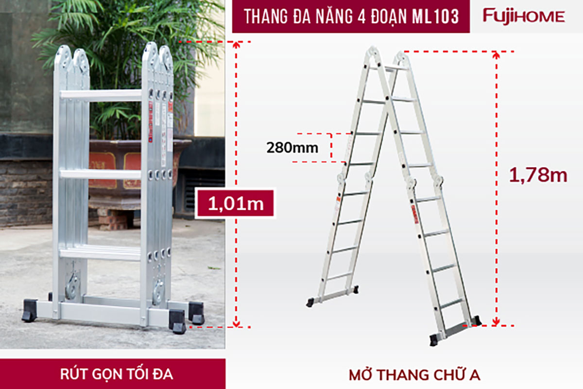Với khả năng gấp gọn chỉ còn 1.01m, Thang nhôm FUJIHOME gấp đa năng 4 đoạn ML103 không chỉ tiết kiệm diện tích khi cất giữ mà còn rất tiện lợi khi di chuyển từ nơi này sang nơi khác. Đây là lựa chọn lý tưởng cho những ai thường xuyên phải làm việc ở nhiều địa điểm khác nhau mà vẫn cần một thiết bị thang vững chắc, an toàn.