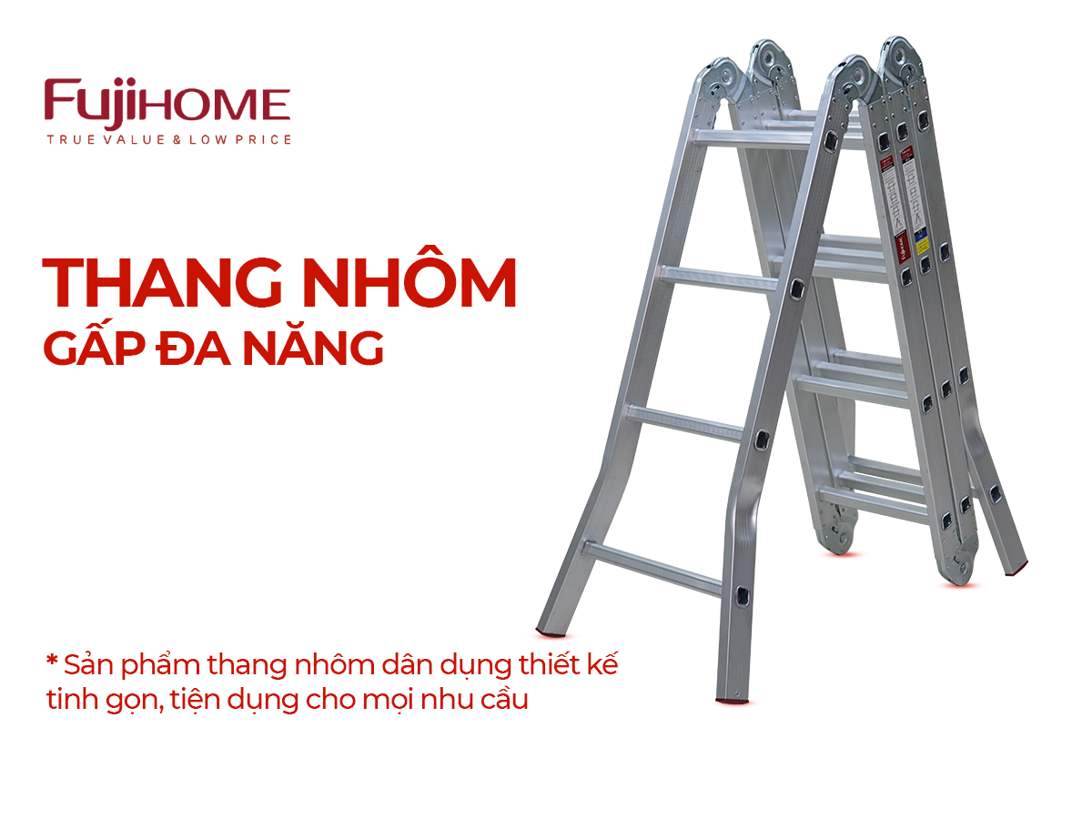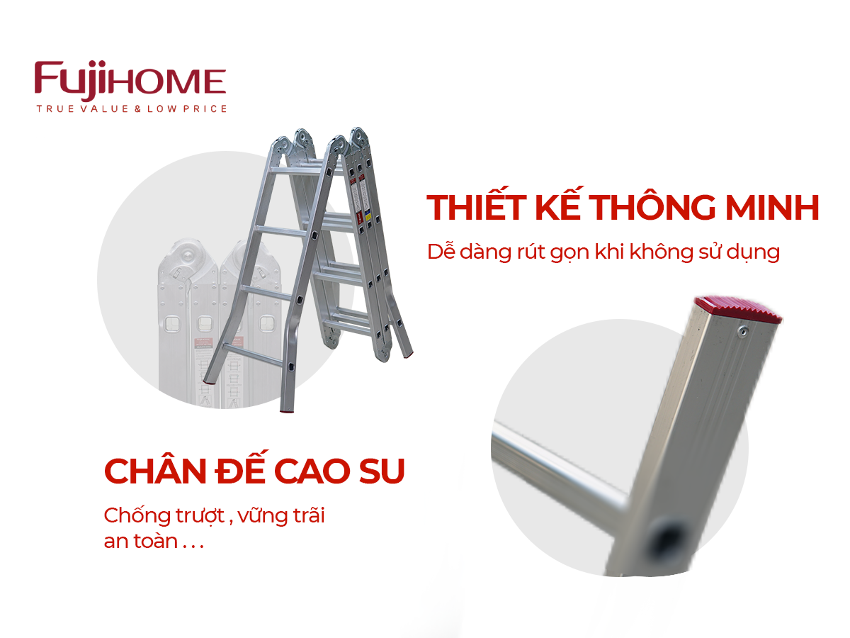 Nhờ vào kết cấu thông minh, thang FUJIHOME ML104S không chỉ bền bỉ mà còn dễ dàng điều chỉnh chiều cao, tiết kiệm không gian khi gấp gọn, và đảm bảo an toàn tuyệt đối khi sử dụng.