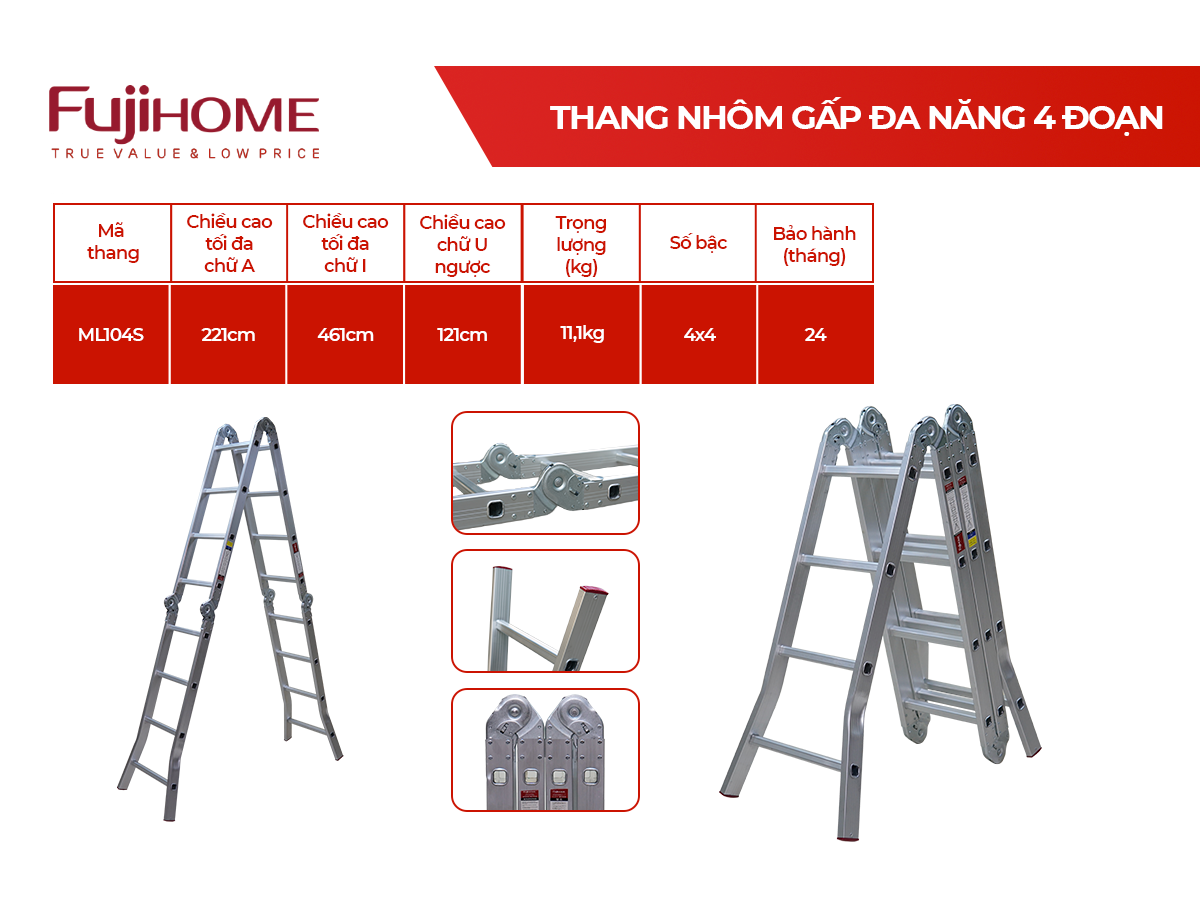 Hơn nữa, với mức giá hợp lý và chính sách bảo hành 24 tháng cùng bảo hiểm rủi ro giá trị cao, FUJIHOME ML104S xứng đáng là lựa chọn hàng đầu cho những ai cần một chiếc thang đa năng, linh hoạt và bền bỉ.