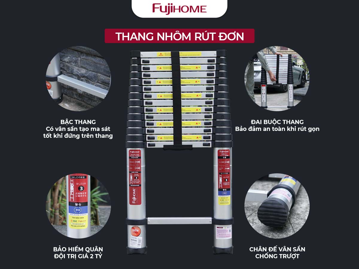 - Thang nhôm FUJIHOME TLI500 rút gọn đơn đạt tiêu chuẩn chất lượng EN131, EN14183 và CE, các tiêu chuẩn quốc tế về an toàn và độ bền.