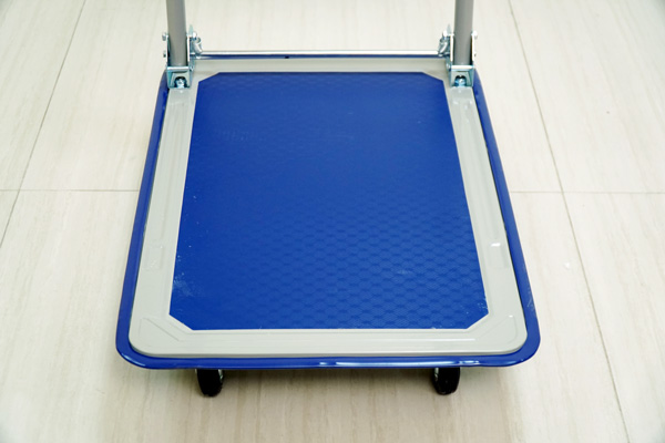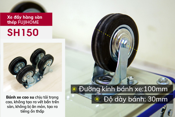 Xe đẩy hàng FUJIHOME SH150 có kết cấu khung xe bằng thép siêu bền, kết hợp với sàn xe rộng 730x475mm, độ dầy sàn 0.6mm – sàn thếp dập đôi, có lớp lót nhựa tổng hợp chống xước màu xanh giúp vận chuyển được nhiều loại hàng hóa có kích thước lớn. Bề mặt sàn được phủ lớp nhựa tổng hợp chống trầy xước màu xanh, không chỉ tạo sự thẩm mỹ mà còn bảo vệ hàng hóa khỏi bị hư hại trong quá trình vận chuyển.