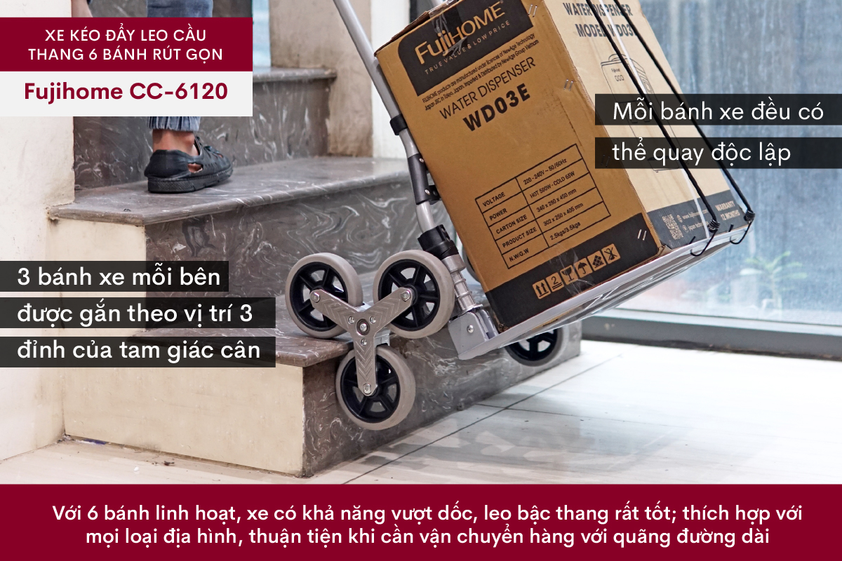 Xe kéo đẩy FUJIHOME CC-6120 leo cầu thang 6 bánh rút gọn là giải pháp lý tưởng cho việc vận chuyển hàng hóa trên các địa hình phức tạp, đặc biệt là cầu thang. Với thiết kế thông minh và chất liệu bền bỉ, sản phẩm này đáp ứng tốt nhu cầu của người dùng trong nhiều tình huống khác nhau.